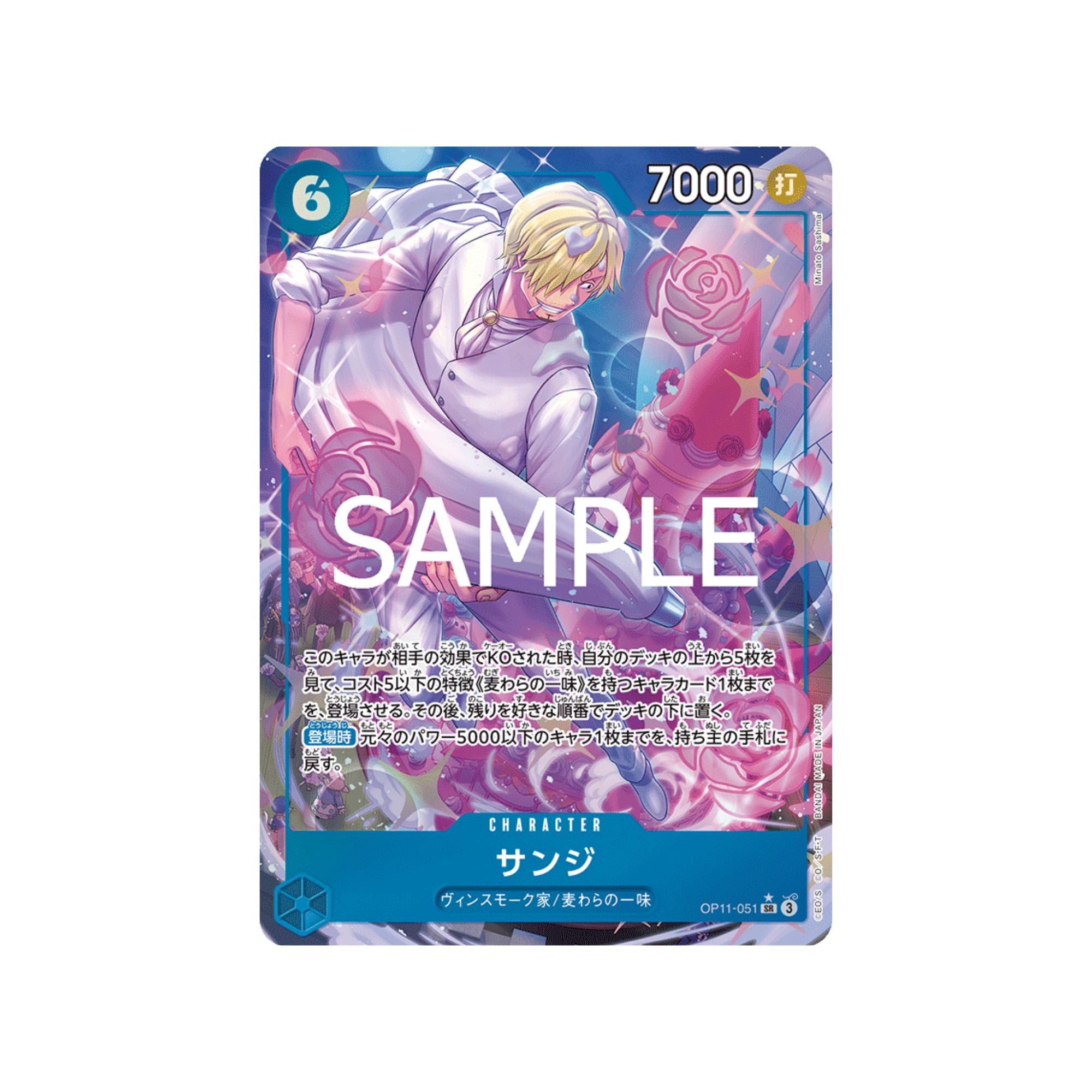 When this Character is K.O.'d by your opponent's effect, look at 5 cards from the top of your deck and play up to 1 {Straw Hat Crew} type Character card with a cost of 5 or less. Then, place the rest at the bottom of your deck in any order.[On Play] Return up to 1 Character with 5000 base power or less to the owner's hand.